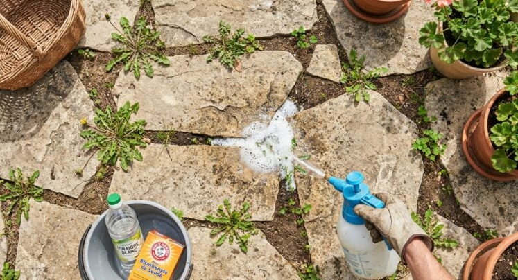 Avec un désherbant maison au vinaigre et au bicarbonate, vos joints de pavés changent vite de visage.