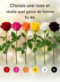 Si la rose blanche ou jaune vous a particulièrement touché(e), vous avez probablement une personnalité calme, positive et réfléchie. Vous appréciez la paix, la simplicité et les moments précieux, et vous apportez souvent joie et optimisme à votre entourage. Si la rose orange ou noire vous a interpellé(e), vous êtes aventureux(se), indépendant(e) et déterminé(e). Vous aimez les défis, vous valorisez l’authenticité et vous n’avez pas peur de tracer votre propre chemin.